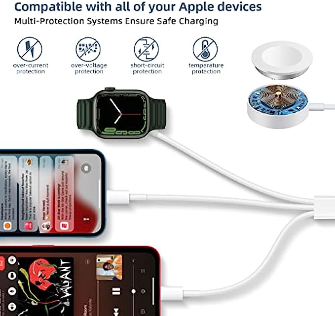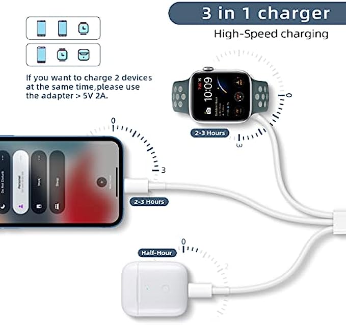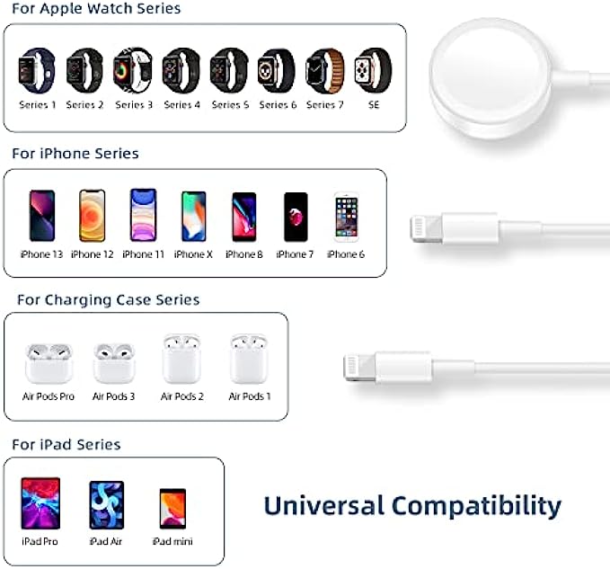 Universal Compatibility: The 3 in 1 apple watch and phone charging cable is Compatible with all iWatch Series 7/6/5/4/3/2/1/SE and iPhone /iPad/Airpods Series.